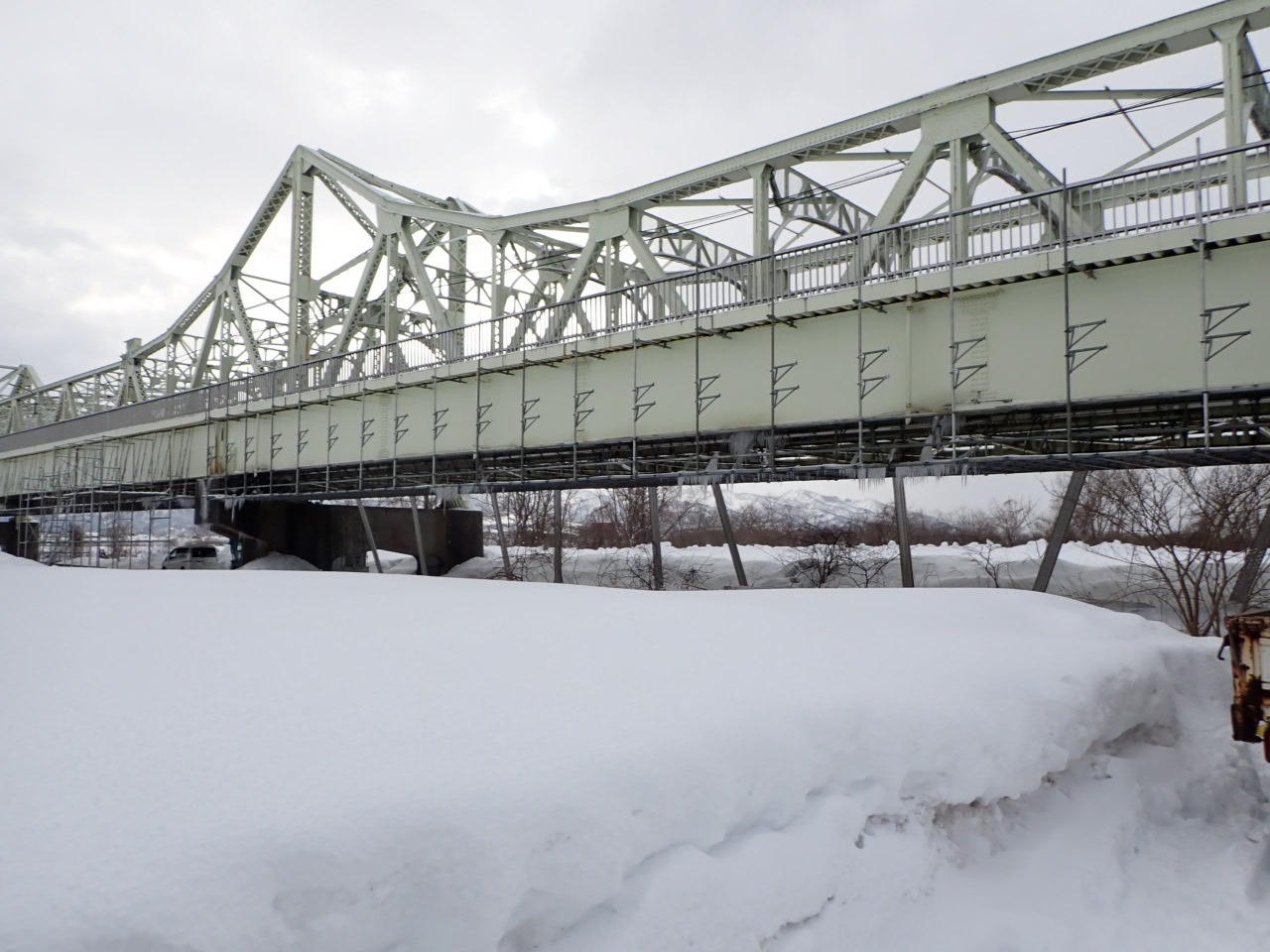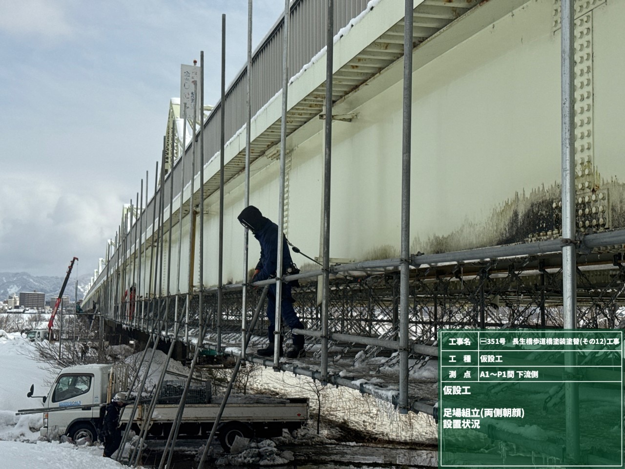 新米現場監督の斎藤です。 今回より長生橋歩道橋塗装塗替工事のブログをお届けします。 2月3日より仮設足場組立を始めました。 今年の雪の量はすごいです!雪に負けずにがんばっています!