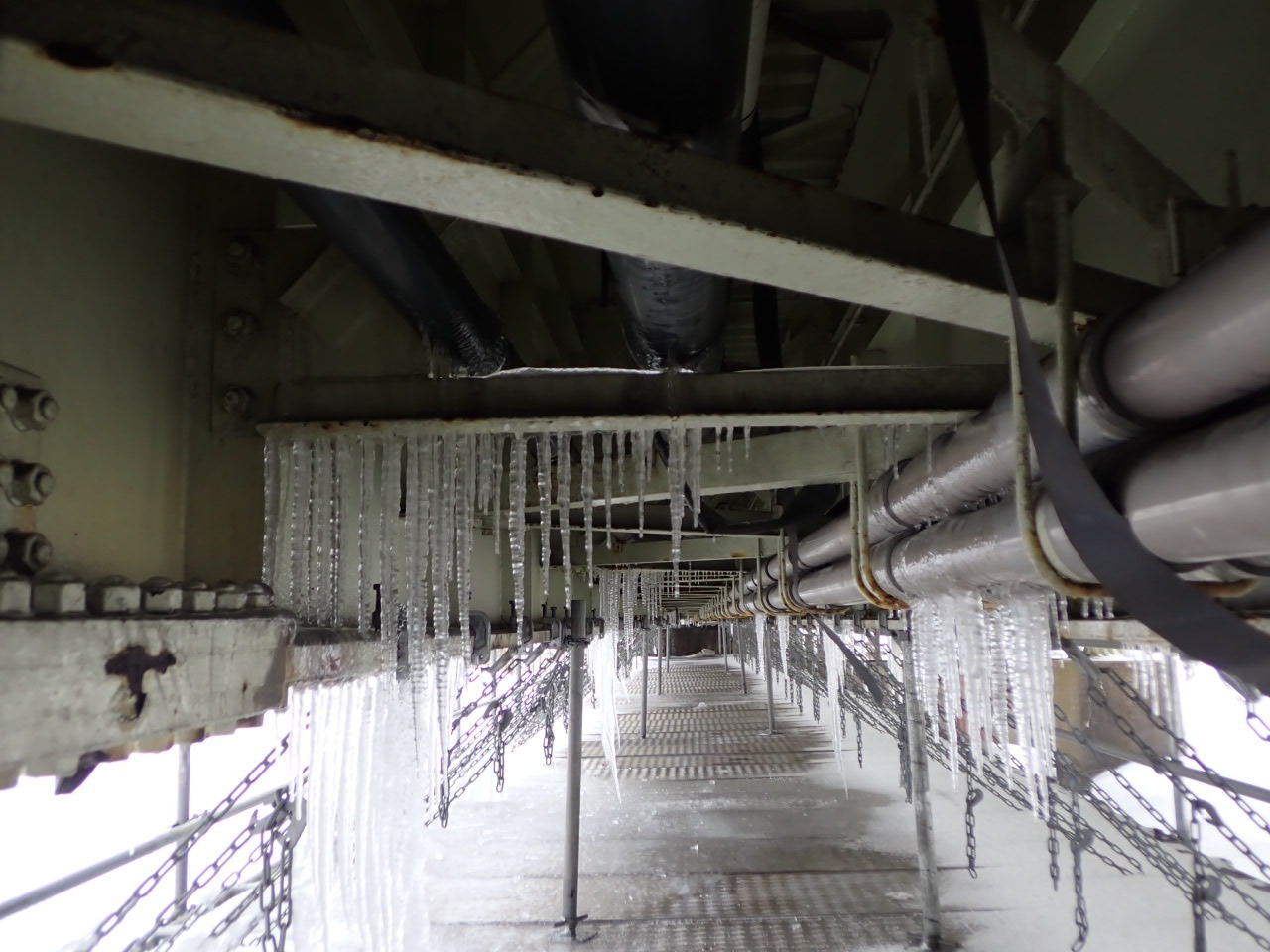 仮設足場には大量のつららが…! 雪国の冬の工事ならではの光景です。