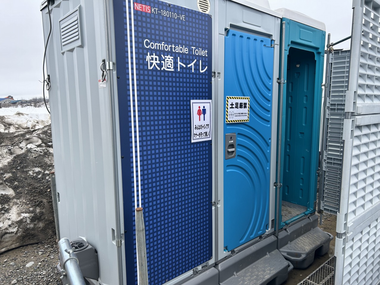 本工事の現場に設置してあるトイレは、「快適トイレ」です! 「快適トイレ」とは…国土交通省が定めた、水洗・清潔・安全(施錠、照明、荷物掛けなど)を備えた仮設トイレです。 男女どちらでも安心に使用できて、におい対策などもバッチリ!ちょっと特別なトイレなんです。