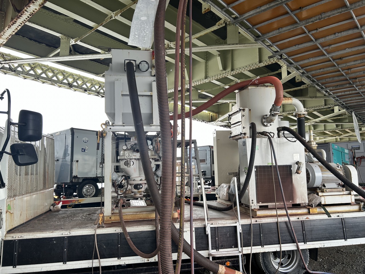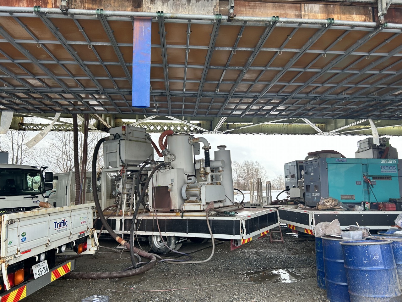 ブラスト施工とは…旧塗膜や錆を落とすために、研削材(今回はステンレスグリッド)を打ちつける素地調整のことです。 素地調整(ケレン)としては、錆・塗膜を完全に除去する最も優れた工法です。 長生橋の橋梁下では、ブラストマシンが絶賛稼働中です!