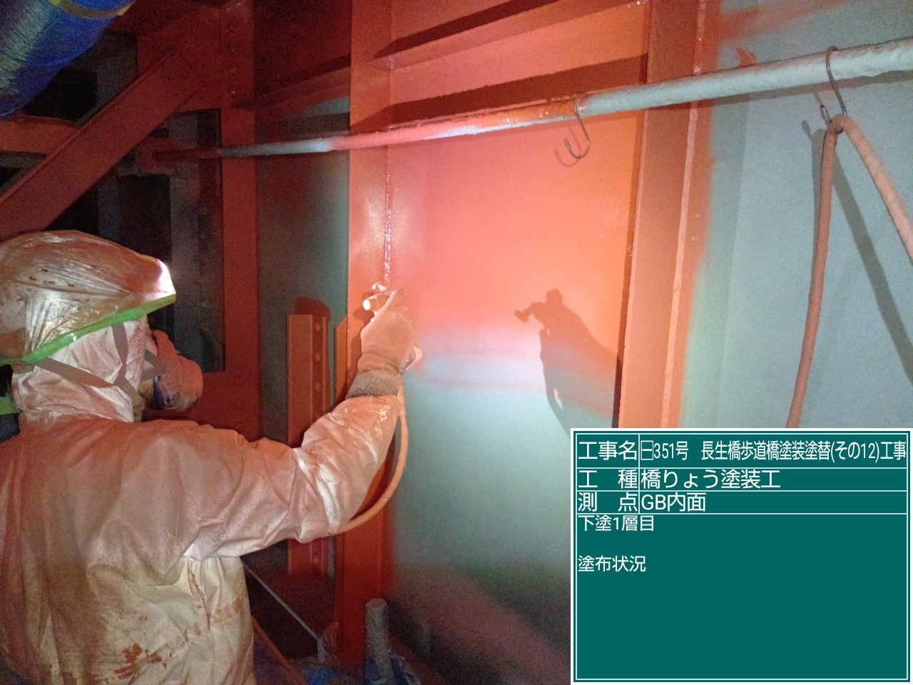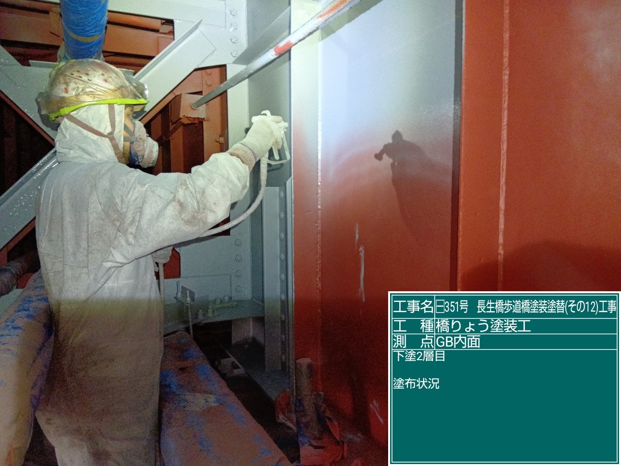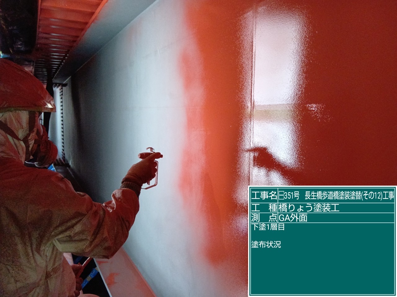 長生橋歩道橋塗替え工事では、素地調整が終わりいよいよ、塗装が始まりました。 写真は、防食下地、下塗一層目の塗布状況です。 公共工事では、それぞれの工程で「塗膜厚」が定められています。 各工程で塗膜厚を測定しており、今回の測定でも規定値を満たしておりました!