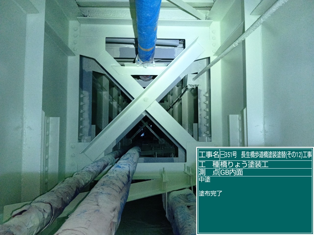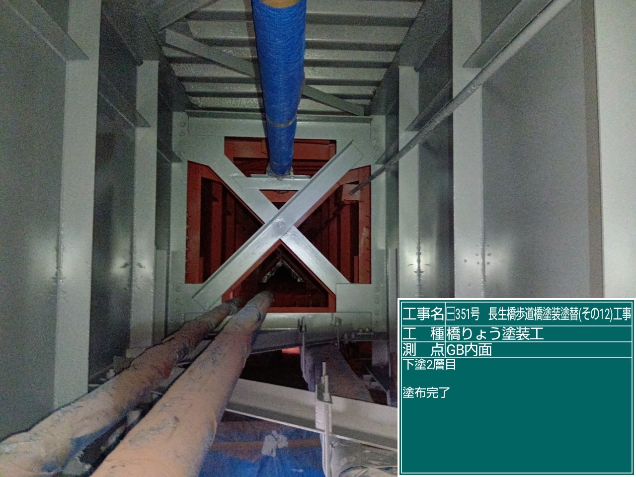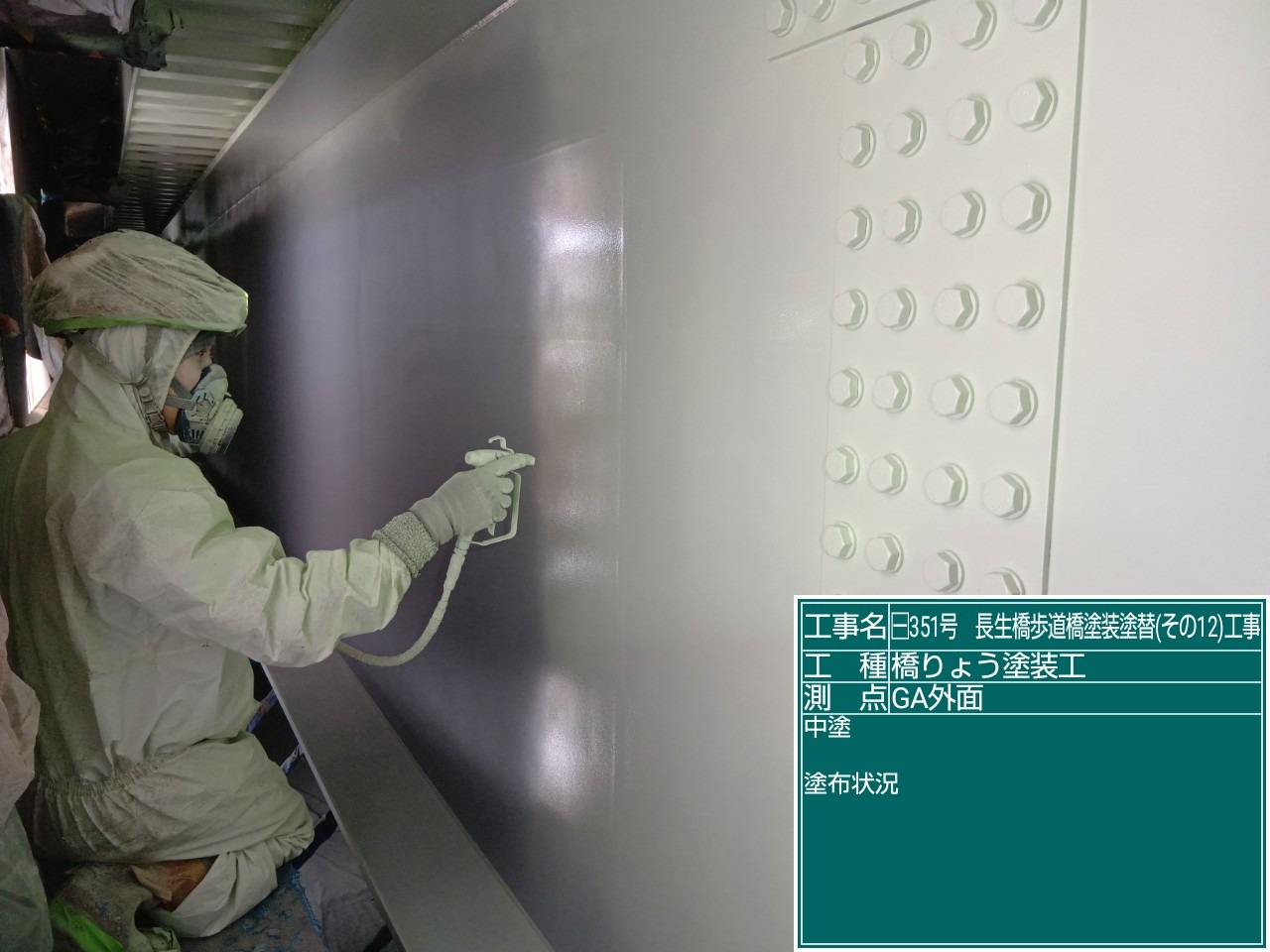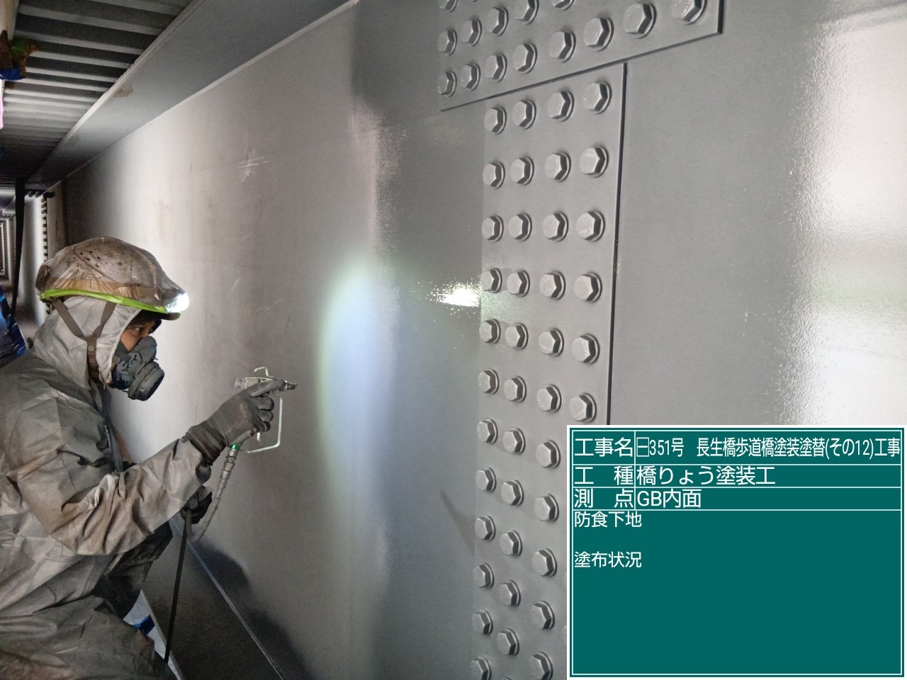 長生橋歩道橋塗替え工事では、素地調整が終わりいよいよ、塗装が始まりました。 写真は、防食下地、下塗一層目の塗布状況です。 公共工事では、それぞれの工程で「塗膜厚」が定められています。 各工程で塗膜厚を測定しており、今回の測定でも規定値を満たしておりました!