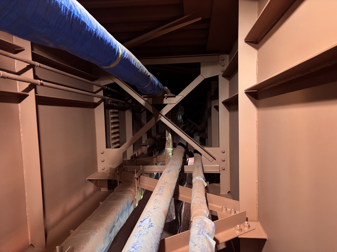 塗装工事も順調に進んでおり、下塗2層目、中塗終了しました。 弊社では塗膜厚管理は各層でかつ、ウエットとドライ両方で測定管理しております。 またスプレー塗装が出来ない狭隘部(きょうあいぶ)は刷毛とローラーを使用します。 残るは上塗!安全作業でがんばります!