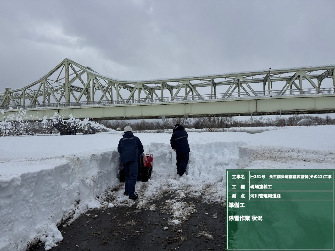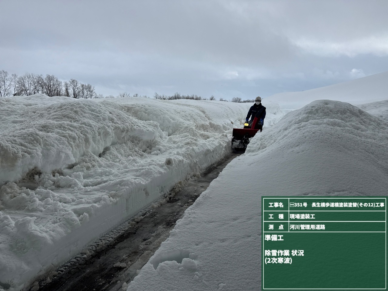 新米現場監督の斎藤です。 今回より長生橋歩道橋塗装塗替工事のブログをお届けします。 2月3日より仮設足場組立を始めました。 今年の雪の量はすごいです!雪に負けずにがんばっています!