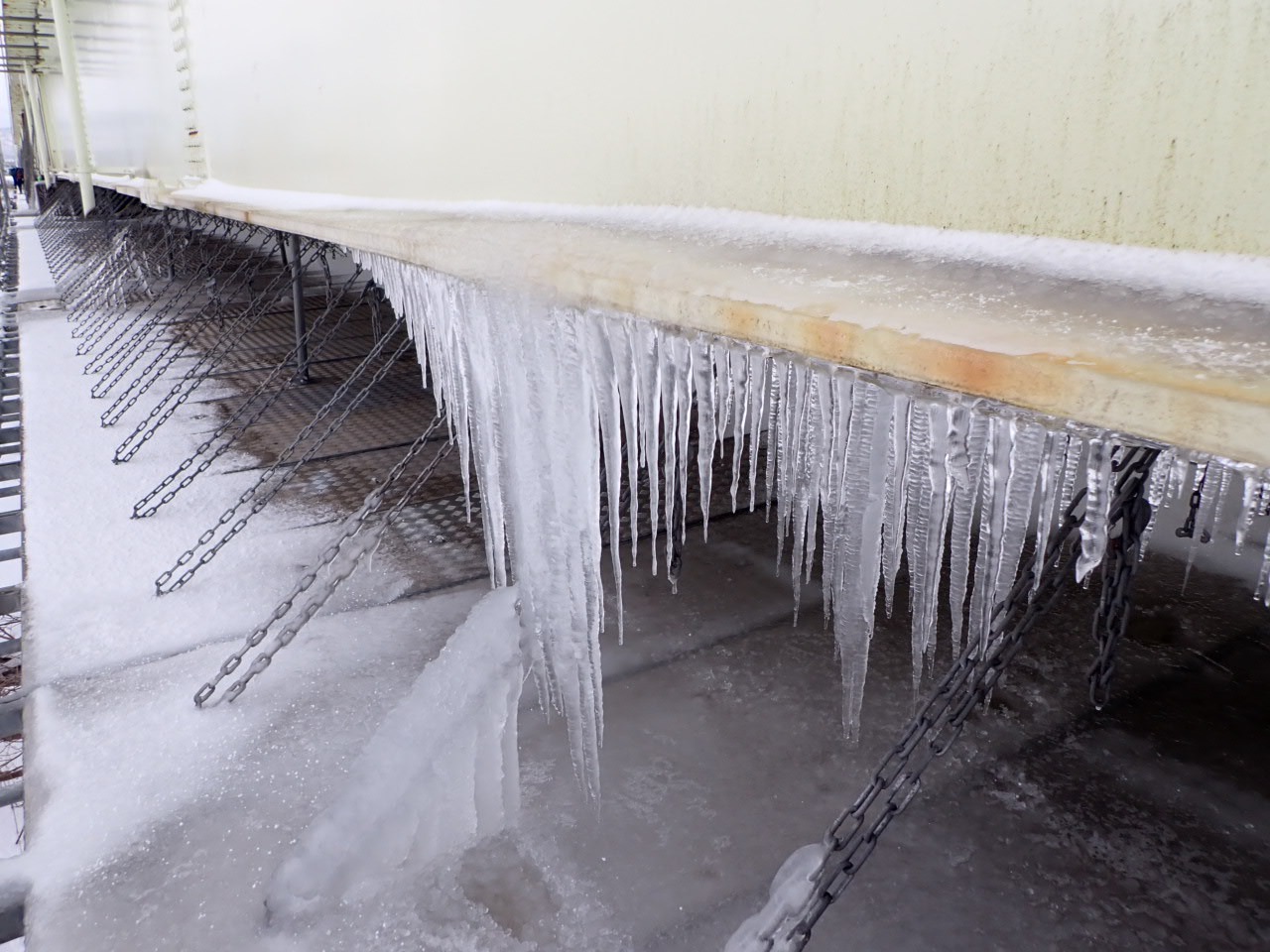 仮設足場には大量のつららが…! 雪国の冬の工事ならではの光景です。