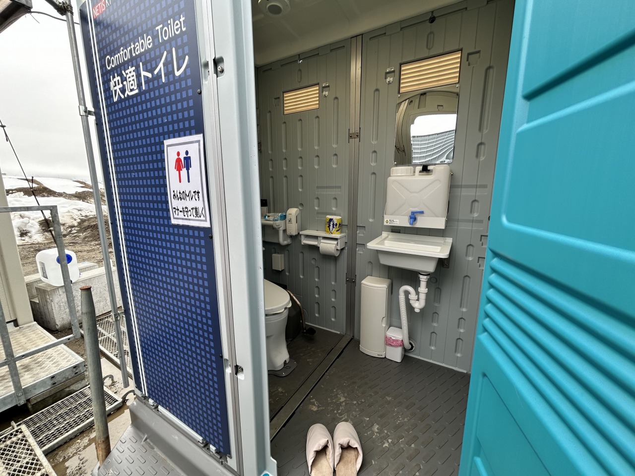 本工事の現場に設置してあるトイレは、「快適トイレ」です! 「快適トイレ」とは…国土交通省が定めた、水洗・清潔・安全(施錠、照明、荷物掛けなど)を備えた仮設トイレです。 男女どちらでも安心に使用できて、におい対策などもバッチリ!ちょっと特別なトイレなんです。